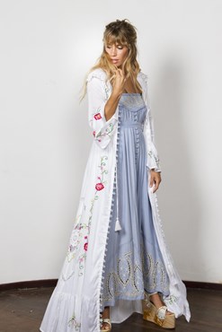 "CLEO" Women's embroidered duster - Ivory with Royal Blue