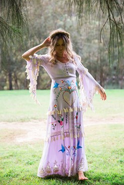 "Hummingbird" Women's printed and embroidered maxi dress with shirred bodice - Lilac